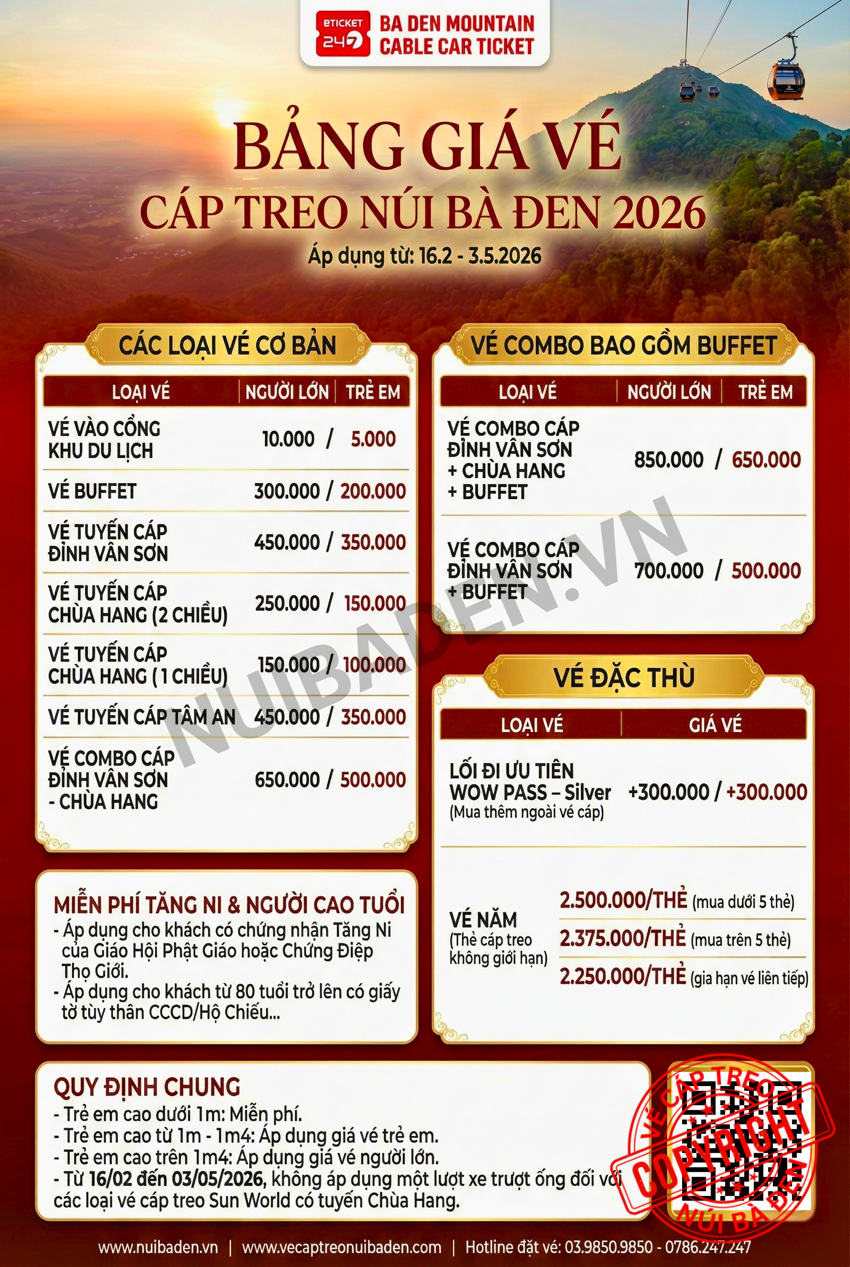 Bảng giá CHÍNH THỨC các loại vé cáp treo Núi Bà Đen phổ biến nhất (áp dụng từ ngày 1/1/2026 đến ngày 15/2/2026). (Bảng giá ưu đãi khác vui lòng kéo xuống dưới để xem tiếp hoặc NHẤN VÀO👉ĐÂY):