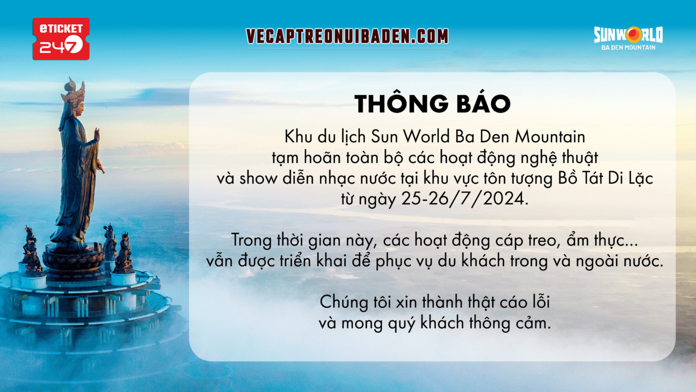 Phòng Vé Cáp Treo Núi Bà Đen xin thông báo tạm hoãn toàn bộ các hoạt động nghệ thuật và show diễn nhạc nước tại khu tôn tượng Bồ Tát Di Lặc thuộc Khu du lịch Sun World Ba Den Mountain trong 2 ngày 25,26/07/2024. Trong thời gian này, các hoạt động cáp treo, ẩm…